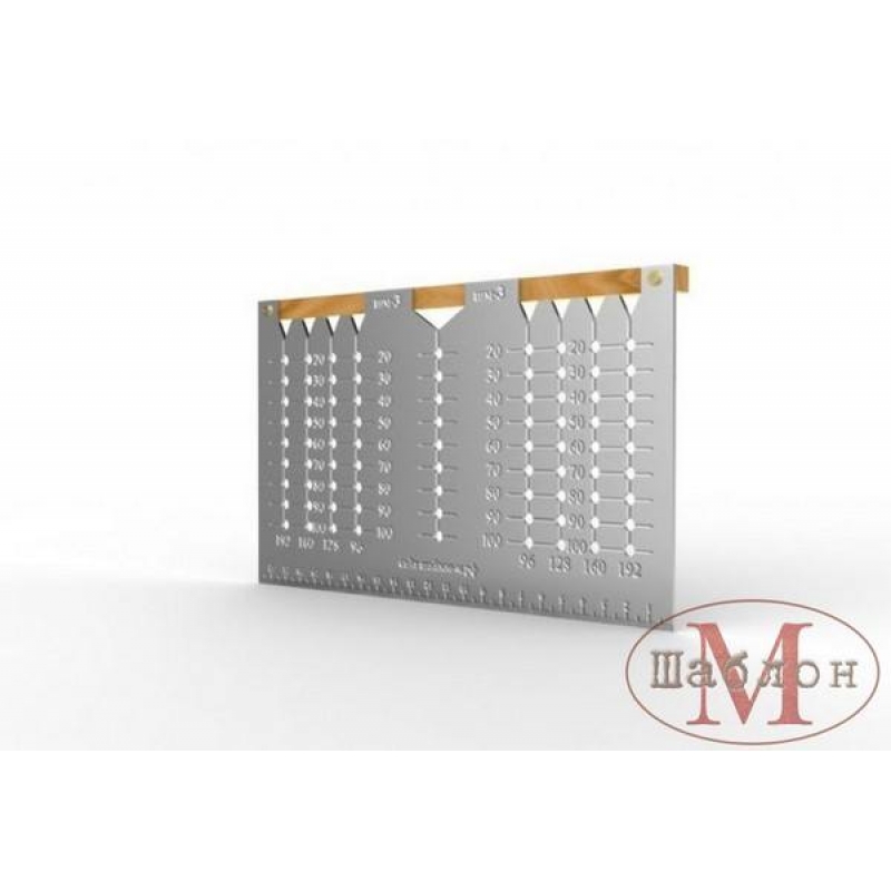 МШ (мебельный шаблон) под артикулом ШМ-3: изделие оснащено линейкой для разметки ручек с параметрами 96/128/160/192 миллиметров, а также кнопок. Изготовлено приспособление из двухмиллиметровой нержавеющей стали, долговечной и прочной.