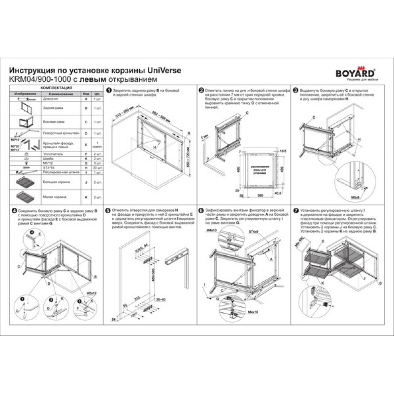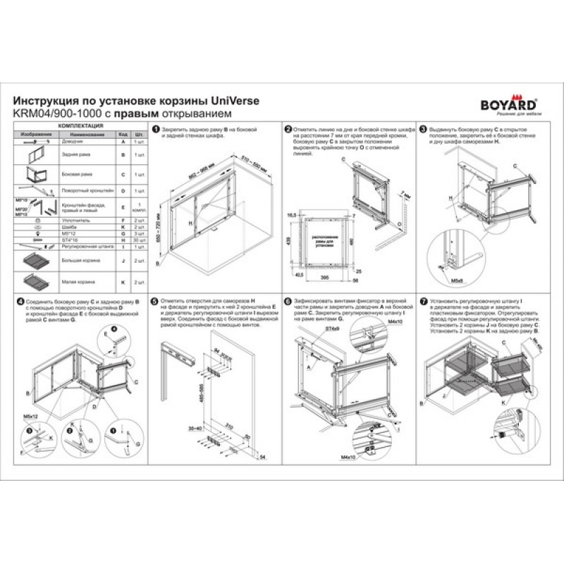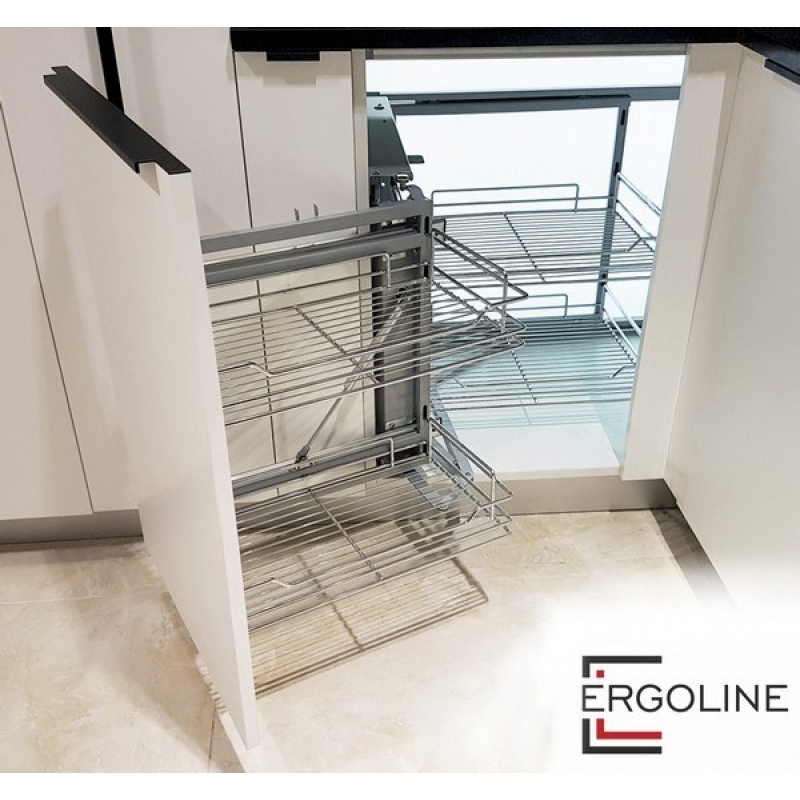 Универсальный «волшебный уголок» UniVerse KRM04 с поворотно-выкатным механизмом создан для рационального использования незадействованных угловых ниш и позволяет эргономично разместить множество предметов быта, включая посуду и технику. Модель комплектуется четырьмя съемными корзинами, расположенными в два уровня. Выверенные габариты прутков и оптимальный рисунок сетки обеспечивают устойчивое хранение внушительного объема различной утвари – каждая корзина выдерживает до 15 кг. Металлические элементы конструкции обладают качественным гальваническим покрытием “Хром полированный” и устойчивы к воздействию агрессивной внешней среды. Выдвижная корзина UniVerse обеспечивает стабильное бесшумное движение и плавное закрывание без рывков даже при максимальной загрузке 60 кг. Модель позволяет комфортно отрегулировать положение фасада в трех плоскостях. Корзина универсальна и может быть установлена как в левых, так и правых модулях на 900-1000мм. Один комплект UniVerse реализуется в двух коробках: в одной поворотно-выкатной механизм, во второй – 4 корзины. Выкатная корзина для кухни UNIVERSE KRM04/900-1000 от бренда Boyard, артикул: KRM04/900-1000, раздел Угловые системы. Этот продукт вы можете приобрести в магазине ПрототиП, ресурс Prototip.by по недорогой цене.