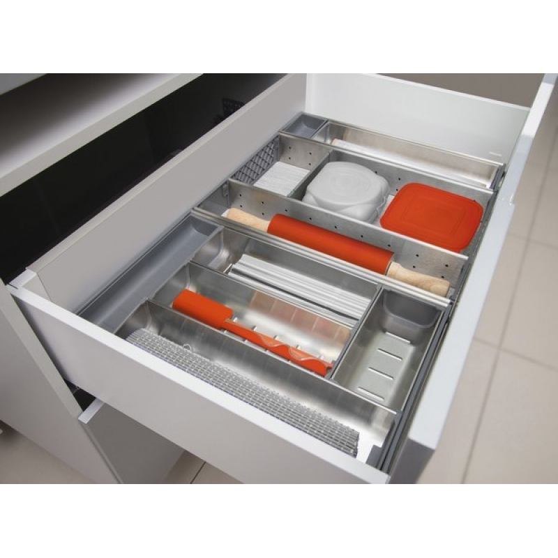 Удобные поддоны-делители из нержавеющей стали для организации внутреннего пространства выдвижных ящиков. Поддоны состоят из нескольких ячеек прямоугольной формы разной ширины. Конфигурация поддонов позволяет обеспечить эргономичное хранение разнообразных предметов: габаритных кухонных принадлежностей (половников, лопаток, пресса для чеснока, закаточной машинки для банок и пр.), инструментов. Поддоны РС06 могут быть дополнением домашней и промышленной мебели, могут размещаться в ящиках как самостоятельно, так и в комплекте с другими поддонами, например с РС04 и РС05. Комбинации из поддонов РС04, РС05, РС06 будут особенно актуальны для широких мебельных модулей.