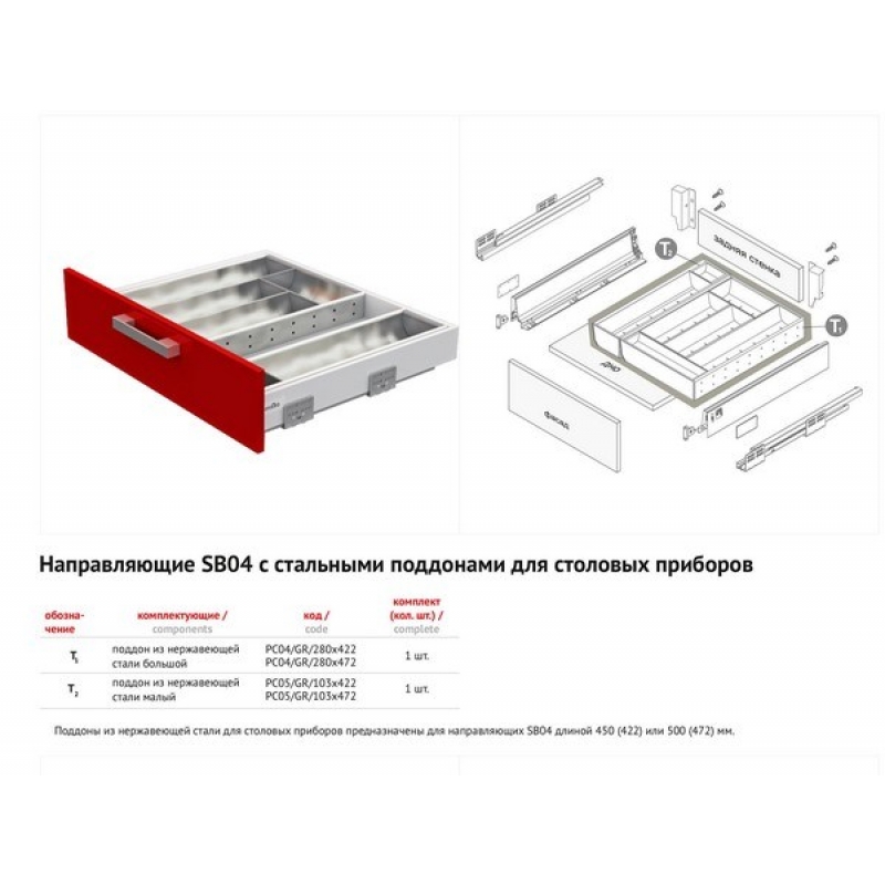 Сборные поддоны из нержавеющей стали позволяют организовать внутреннее пространство выдвижных ящиков. Поддоны представляют собой набор лотков с разной шириной, с помощью которых можно создать наиболее удобную индивидуальную конфигурацию ящика. Ассортимент В размерном ряду 4 модели, которые отличаются по ширине и предназначены для ящиков с самой востребованной глубиной 450 мм и 500 мм. Материал : нержавеющая сталь, высокопрочный пластик Цвет : универсальный темно-серый, «нержавейка» Поддон из нержавеющей стали PC04/GR/280x472 от производителя Boyard, артикул: PC04/GR/280x472, раздел Лотки для столовых приборов. Этот продукт вы можете купить или заказать в магазине ПрототиП по наилучшей цене.