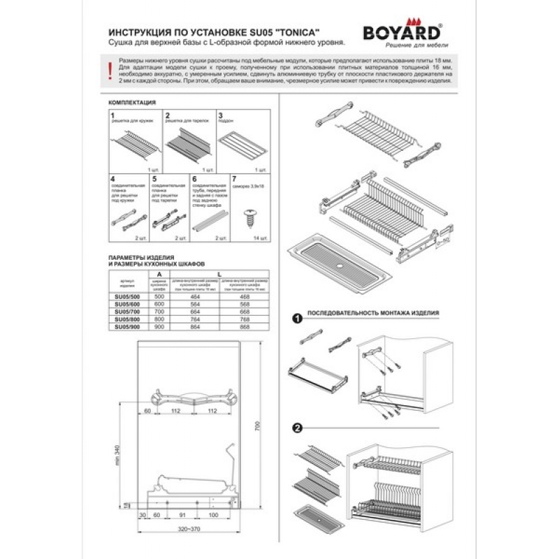 Сушка Tonica для верхней базы с L-образной формой нижнего уровня для устойчивого вертикального хранения разноформатных тарелок. Модель позволяет размещать значительное количество вымытой посуды: допустимая нагрузка на каждый уровень 20 кг. Регулировка позволяет устанавливать данную сушку в мебельный модуль с размерами по глубине от 320 до 370мм. Tonica предусматривает быстрый и легкий монтаж. Комплект включает съемный прочный поддон из экологичного матового пластика для сбора воды и набор крепежа. Модель выполнена из круглой проволоки в гальваническом покрытии «Хром полированный». Внимание, важная информация! При возникновении необходимости установки сушки SU05 Tonica в мебельный короб глубиной 290-340 мм, необходимо сдвинуть сушку в переднюю часть короба на 30 мм, относительно схемы установки, пересчитав присадочные размеры, для установки пластиковых держателей верхнего и нижнего уровня. Следует понимать, что внутренний отступ на схеме установки сделан с учётом того, чтобы в сушке можно было свободно размещать тарелки диаметром до 30 см. В случае, если сушка будет установлена вплотную к передней кромке стенок короба, максимальный возможный диаметр тарелок сократится. Внимание, важная информация! Размеры нижнего уровня сушки рассчитаны под мебельные модули стандартных габаритов 500/600/700/800/900мм (с внутренним проемом 464,564,664,764,864мм соответственно). Данные размеры предполагают использование плиты 18мм. Для адаптации модели сушки к проему, полученному при использовании плитных материалов толщиной 16мм (внутренний проем 468,568,668,768,868мм), необходимо аккуратно, с умеренным усилием, сдвинуть алюминиевую трубку от плоскости пластикового держателя на 2мм с каждой стороны. При этом, обращаем ваше внимание, чрезмерное усилие может привести к повреждению изделия. Сушка TONICA SU05/800 от производителя Boyard, артикул: SU05/800, каталог Многоуровневые сушилки. Этот товар вы можете приобрести или заказать в магазине Prototip.by по наилучшей цене.