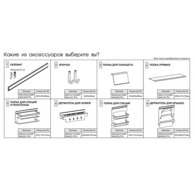 Среднее количество ножей обитающих на обычной кухне – не менее пяти. Для такого инструмента нужен не только удобный, но и безопасный метод хранения. Универсальный держатель от BOYARD позволит грамотно хранить ножи – не допуская их контакта с другими предметами, поможет организовать рабочее пространство и исключит возможность случайной травмы. Материал: Анодированный алюминий, который обеспечивает продуктам B-Planum защиту от коррозии. Изделия из этого материала прочны, долговечны и просты в уходе: систему достаточно протирать мягкой влажной тканью без применения чистящих средств. Держатель для ножей PRACTIC SRK521/TFL от бренда Boyard, артикул: SRK521/TFL, раздел Навесные системы B-Planum. Этот товар вы можете купить или заказать в магазине ПрототиП по наилучшей цене.