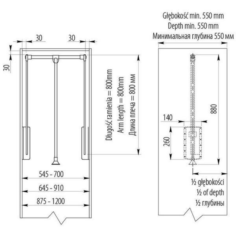 Пантограф 45/60 стальной, черный - гардеробный механизм, посредством которого опускается штанга с одежными вешалками в шкафу. Вы открываете (отодвигаете) дверь шкафа, тянете за ручку механизма, перекладина с вешалками смещается вниз, и вы берете нужный предмет одежды. ПРЕИМУЩЕСТВА - Возможность хранить одежду в верхнем отделении шкафа так, чтобы быстро и легко достать ее. - В подвешенном состоянии одежда не мнется, сохраняет опрятный внешний вид. - Одежда проветривается, благодаря чему отсутствует затхлый запах. УСЛОВИЯ ЭКСПЛУАТАЦИИ - Механизм выдерживает нагрузку не более 8 кг. - Телескопическая штанга перед установкой в шкаф регулируется в пределах 45-60 см. Пантограф 45/60 стальной, черный от производителя GTV, артикул: PG-ST4560-20, раздел Пантографы. Этот продукт вы можете приобрести или заказать в магазине ПрототиП по хорошей цене.