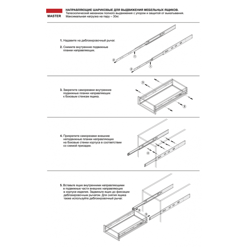 Master DB4504 – шариковые направляющие полного выдвижения без амортизации, выполненные по европейскому стандарту. Это надежный партнер мебельщика в производстве добротной мебели сегмента «средний» и «средний+». Master DB4504 обладает современными характеристиками и обеспечивает стабильную работу ящиков и плавный, равномерный ход, сравнимый по комфорту с движением современных систем выдвижения. Модель надежна и долговечна – она обладает оптимальной грузоподъемностью 30 кг и гарантирует бесперебойную работу направляющей на протяжении более 50 000 циклов открывания/закрывания. Шариковые направляющие Master DB4504Zn/550 от бренда Boyard, артикул: DB4504Zn/550, раздел Направляющие шариковые. Этот товар вы можете приобрести или заказать в магазине ПрототиП по прекрасной цене.