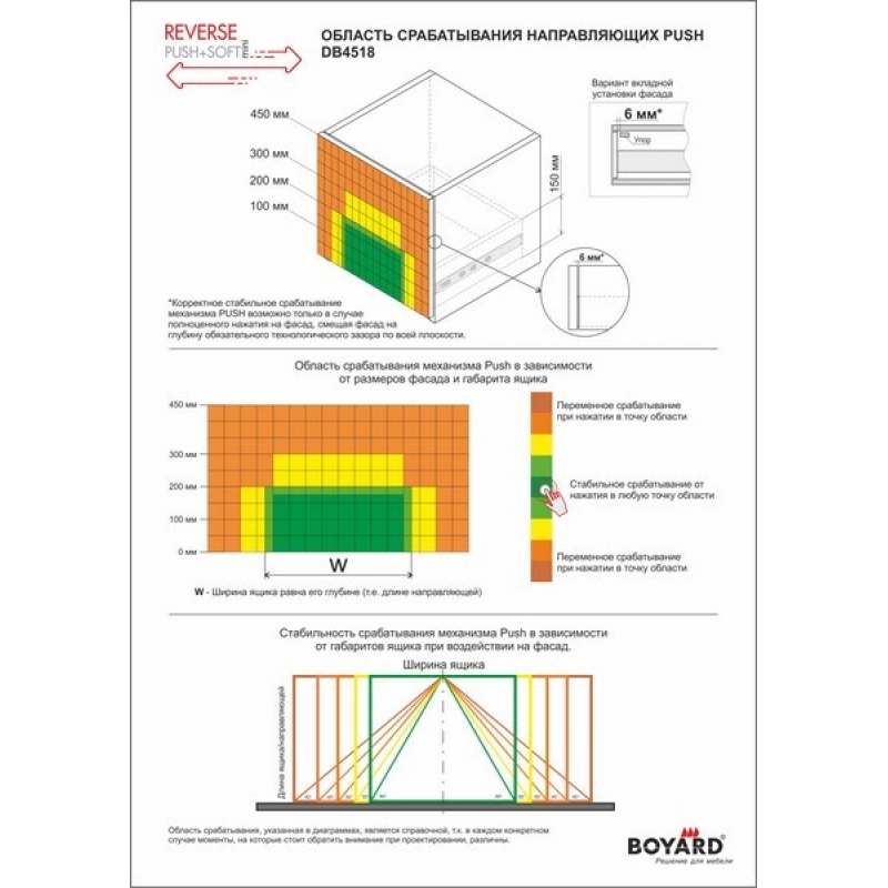 REVERSE MINI DB4518 – шариковые направляющие полного выдвижения, совмещающие в своём устройстве инновационный механизм толкателя, обеспечивающего открытие от нажатия в любую точку фасада, и доводчика, обеспечивающего плавное и бесшумное доведение, одновременно. Направляющие представлены в размерной линейке от 300 до 500 мм. DB4518 обеспечивают полное выдвижение с 400 мм. Гарантированное количество циклов бесперебойной работы – 50 000 при максимальной грузоподъёмности 30 кг. Шариковые направляющие REVERSE MINI DB4518Zn/500 от бренда Boyard, артикул: DB4518Zn/500, раздел Направляющие шариковые. Этот товар вы можете купить в магазине ПрототиП по наилучшей цене.