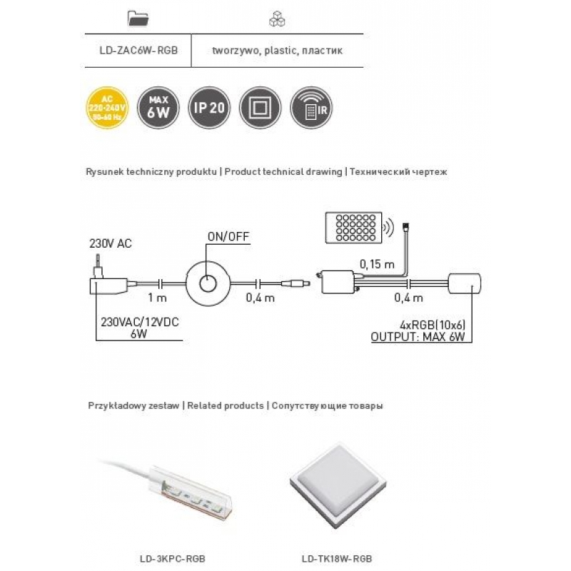 Описание товара Блок питания для светодиодов 220/12V, 6W, IP20, для светильников и клипс с кабелем и ножным выключателемем RGB беспроводной (радио RGB контролер, дистрибьтер на 4 выхода) Для того, чтобы подключить светодиодный светильник или ленту к электрической сети, необходимо использовать специальный блок питания. У большинства светодиодных приборов, представленных сегодня на рынке, напряжение питания отличается от стандартного значения 220 вольт бытовой электросети. При включении LED светильника напрямую в сеть в 220 вольт, осветительный прибор выйдет из строя. Поэтому для его гарантированной бесперебойной работы требуется использовать блок питания соответствующий мощности, с дополнительным запасом не менее 10% по мощности, для компенсации возможных перепадов напряжения. В данную модель блока питания дополнительно входят: провод выключатель распределитель Блок питания для светодиодов 220/12V, 6W, IP20, для светильников и клипс с кабелем и ножным выключателем RGB беспроводной (радио RGB контроллер, дистрибьютер на 4 выхода) от бренда GTV, артикул: LD-ZAC6W-RGB, каталог Блоки питания для светодиодов. Этот товар вы можете купить в магазине ПрототиП, ресурс Prototip.by по наилучшей цене.