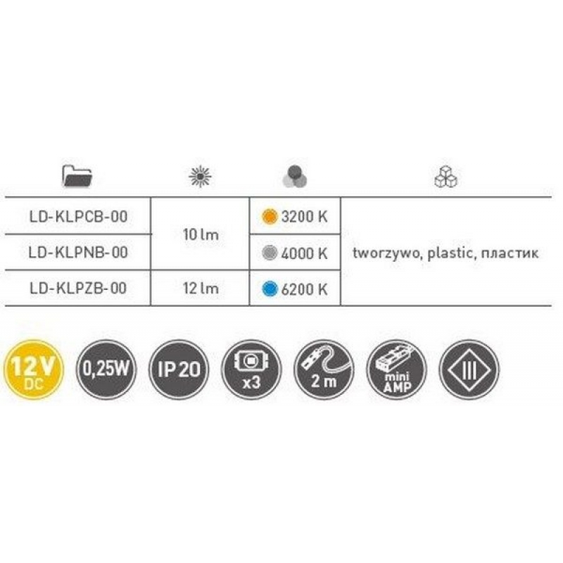 Описание товара Клипса пластиковая для стеклянной полки светодиодная на стекло 10мм, 3 диода 0,25W, 12V, 2м провод, синий свет - используется для подсветки стеклянной полки. Отдельные модели клипс различаются по количеству светодиодов, возможной толщиной стеклянной полки и цветом свечения. Для подключения светодиодной клипсы к электрической сети необходимо использовать блок питания соответствующей мощности. Клипса пластиковая для стеклянной полки светодиодная на стекло 10мм, 3 диода 0,25W, 12V, 2м провод, синий свет от бренда GTV, артикул: LD-KLPNB-00, раздел Клипсы светодиодные на стеклянную полку. Этот товар вы можете купить или заказать в магазине ПрототиП по доступной цене.