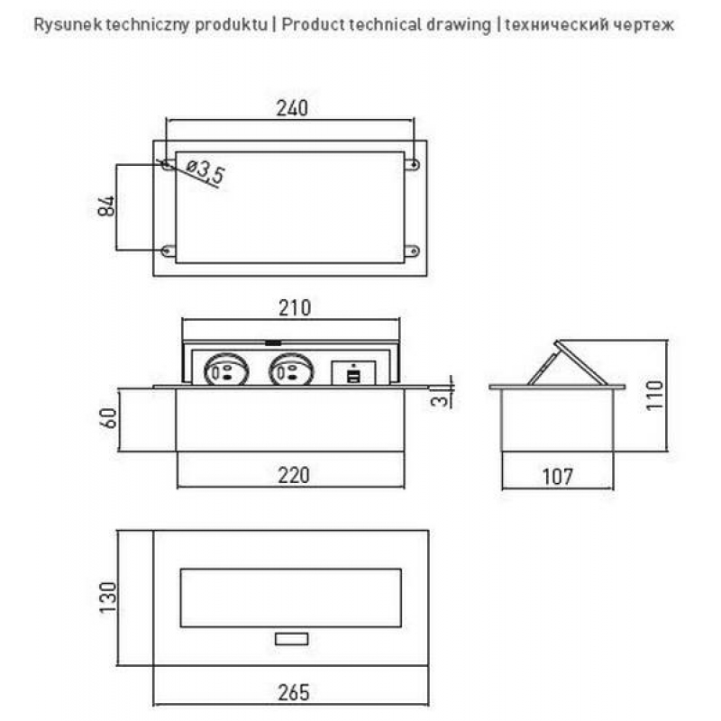 Описание товара Удлинитель прямоугольный врезной 2 розетки AE-PBU2GU-20 (French) 2xUSB, черный, с проводом 1,5 метра - полезный функциональный элемент интерьера вашего офиса или комнаты. Устройство устанавливается в столешницу и в «спящем» состоянии скрыто от ваших глаз. Как только вам потребуется розетка, Вы легким нажатием откроете рабочую зону удлинителя и подключите компьютер, телефон, светильник или иной гаджет к электросети. Данная модель удлинителя также оснащена USB-портами, благодаря которым это уже не просто розеточный блок, а многофункциональное устройство с дополнительными техническими возможностями. * Данная модель удлинителя имеет Евро розетку. Удлинитель прямоугольный врезной 2 розетки AE-PBU2GU-20 (French) 2xUSB, черный, с проводом 1,5 метра от производителя GTV, артикул: AE-PBU2GU-20, каталог Розетки выдвижные. Этот товар вы можете приобрести в магазине Prototip.by по хорошей цене.