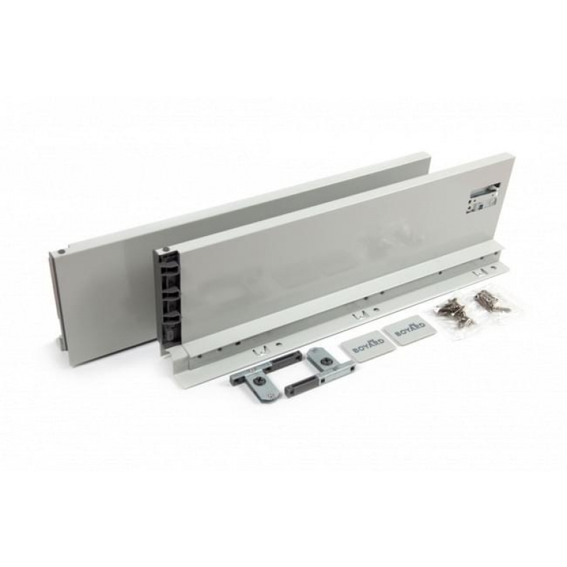 SBDW12 – прямые боковые стенки (левая и правая) для сборки мебельного ящика системы выдвижения СТАРТ средней высоты 116 мм для формирования выдвижного мебельного ящика с минимальной высотой проёма 147 мм . Прямые боковины отличает от традиционных эстетически более красивая лаконичная форма, которая, кроме этого, позволяет экономить внутреннее пространство ящика. Толщина прямых боковин – 12,8 мм . Также, выдвижной мебельный ящик с прямыми боковинами получается более глубоким и монолитным. Ящик со сплошными боковыми стенками, без рейлингов, более удобен для хранения разных по габаритам, форме и длине предметов. Более высокие боковины лучше удерживают ряды из плоских тарелок, крышек, не позволяя им заваливаться набок и падать в пространство между рейлингами и корпусом мебели. При открытии и закрытии модуля с высокими сплошными боковинами половники, скалки, шампуры и другая длинногабаритная утварь не будет попадать в пространство между рейлингами и корпусом мебели и, соответственно, не помешает его движению. Боковины с держателями задней стенки и фиксаторами фасада выполняют защитно-декоративную функцию, а также соединяют между собой основные элементы выдвижного ящика: передняя фасадная панель, задняя стенка и дно. Кроме этого, боковины выполняют функцию регулировки фасада выдвижного ящика, функцию подвижного крепления выдвижного ящика к опорной направляющей скрытого монтажа DB8181, предварительно установленной на боковой стенке непосредственно мебельного изделия и защищают от непреднамеренного снятия при полном выдвижении механизма. Боковые стенки SBDW12, покрытые порошковой эмалью методом распыления с последующей сушкой при температуре 90 градусов, прослужат весь эксплуатационный срок, даже в условиях агрессивной кухонной среды. В комплект также входят декоративные заглушки с логотипом BOYARD. Прямые боковины для среднего ящика представлены в вариантах монтажной длины от 300 до 500 мм в трёх популярных цветах: графитовый, белый и серый . Для сборки выдвижного мебельного ящика с помощью боковин SBDW12 необходимо самостоятельно изготовить фасад, заднюю стенку и дно ящика с учетом собственных пожеланий и потребностей по ширине и высоте готового ящика. Высоту выдвижного мебельного ящика можно увеличить, используя прямоугольные рейлинги SBR09 и держатели рейлинга SBH40, в том количестве, ящик какой высоты вам необходим. Внимание! Важная информация! Групповая коробка боковых стенок SBDW12 включает 10 комплектов боковин, а также 10 отдельных пакетов с держателями фасада, декоративными заглушками и необходимым крепежом. В случае приобретения боковых стенок в розницу следует обязательно помнить, что для каждого приобретённого комплекта боковин вам обязательно должны положить пакетик с комплектующими и крепежом. Обязательно проверяйте наличие необходимого количества пакетиков с комплектующими при получении товара, а также не забывайте о них при распаковке вашего заказа. Прямые боковые стенки СТАРТ (Boyard) средней высоты SBDW12/GR/450 от производителя Boyard, артикул: SBDW12/GR/450, категория Системы выдвижения ящиков. Этот товар вы можете купить или заказать в магазине ПрототиП, ресурс Prototip.by по выгодной цене.